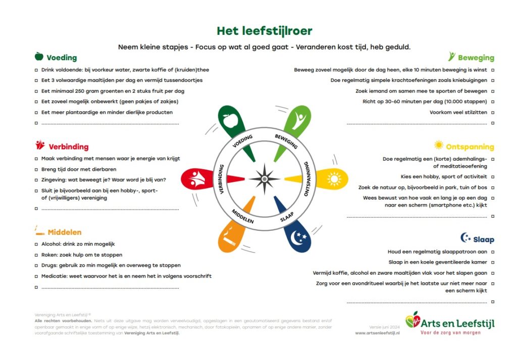 Afbeelding: “Het Leefstijlroer” (versie juni 2024), Vereniging Arts en Leefstijl. Met schriftelijke toestemming gebruikt.